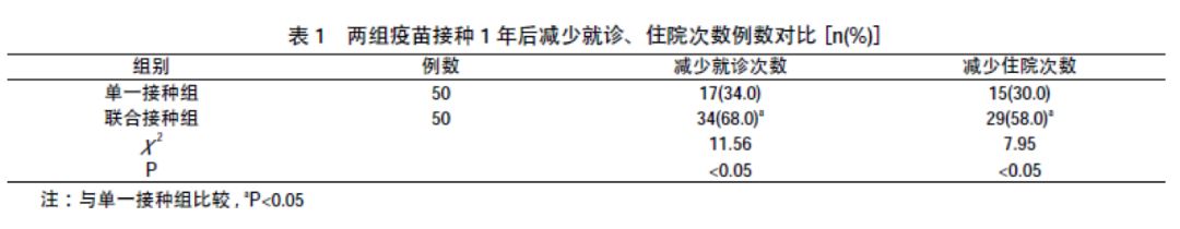 疫苗接種1 年后, 單一接種組有17 例(34.0%) 減少了就診次數(shù), 15 例(30.0%) 減少了住院次數(shù);聯(lián)合接種組有34 例 (68.0%) 減少了就診次數(shù), 29 例(58.0%) 減少了住院次數(shù)。聯(lián)合接種組減少就診次數(shù)例數(shù)和減少住院次數(shù)例數(shù)均顯著高于單一接種組(χ2=11.56、7.95, P<0.05)。見下表: