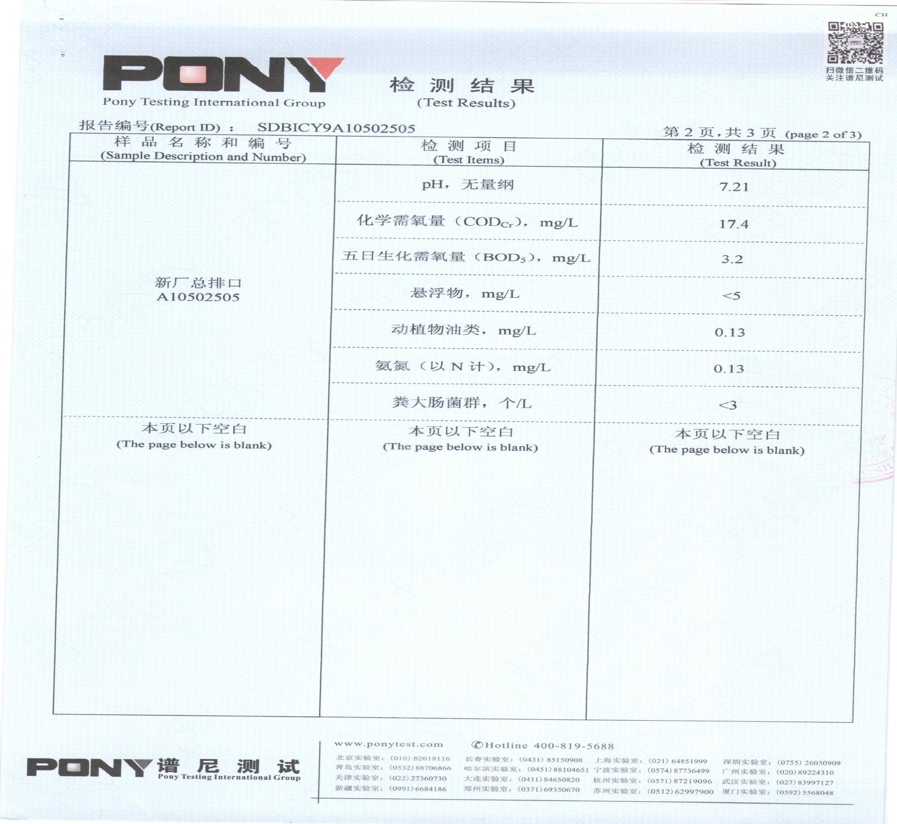 COD:17.4mg/L; 氨氮:0.13mg/L; PH: 7.21mg/L; 五日生化需氧量:17.4mg/L ; 動(dòng)植物油類(lèi):0.13mg/L |